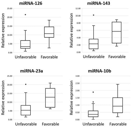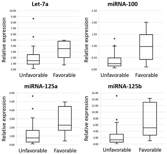 The comparative analysis of miRNA expression levels between diffuse large B-cell lymphoma (DLBCL) groups with an unfavorable (n = 36) and favorable (n = 7) prognosis. The figure presents medians, upper and lower quartiles, nonoutlier ranges, and outliers appearing as circles.