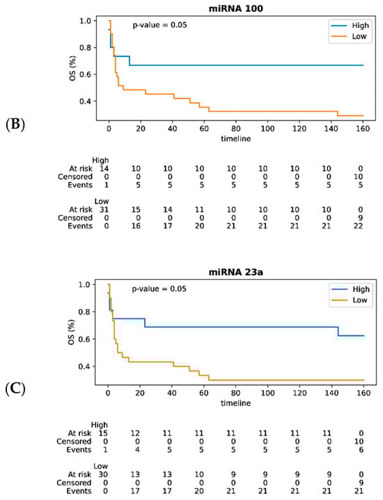 The overall survival (OS) curves were plotted for patients; the patients were divided into high- and low-expression groups in accordance with the mean expression of each out of eight miRNAs statistically significantly related to prognosis (Figure 4). Kaplan–Meier survival analysis demonstrated that the high expression levels of miRNA-125a (p = 0.03), miRNA-23a (p = 0.05), and miRNA-100 (p = 0.05) in DLBCL patients were associated with favorable prognosis and better overall survival.