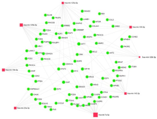 Targeted analysis of miRNA-10b, -100, -125a, -125b, -126, -143, -23a and let-7a using the miRnet 2.0 platform. Red and green rhombi denote microRNAs and their target genes, respectively.