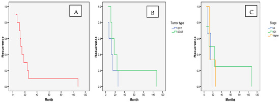 Time to NEOC recurrence after conservative therapy: (A). overall and according to (B). tumor type and (C). stage.