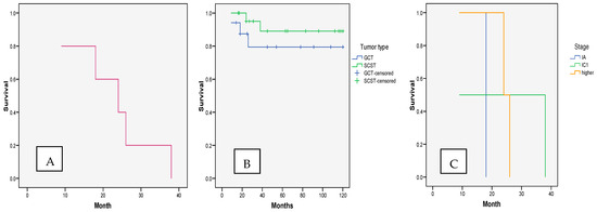 Adverse outcomes occurred mostly between the 20th and 30th postoperative months (mean time to adverse outcome: 23.01 ± 10.68; median: 24; range: 9–38). The duration to an adverse outcome was similar for both GCTs and SCSTs (p = 0.441). There were also no significant differences in the duration of recurrence-free survival with regards to the NEOC stage (p = 0.622) (Figure 2).
