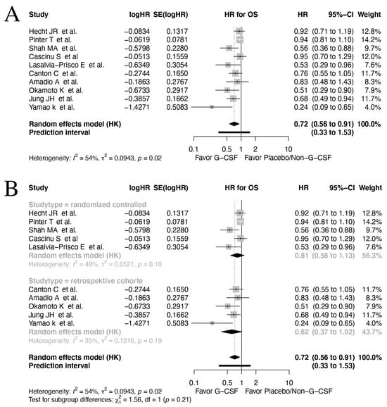 Ten studies reported data on OS [57,59,60,61,62,64,65,67,68,69]. Across all types of included cancers and study designs, a significant improvement on OS amongst G-CSF-treated patients compared to those with placebo/no prophylaxis were found (HR 0.72, 95% CI: 0.56–0.91, I2: 54%, Figure 2A). However, as evident from the prediction interval (95% CI: 0.33–1.53), other studies cannot confirm these findings.