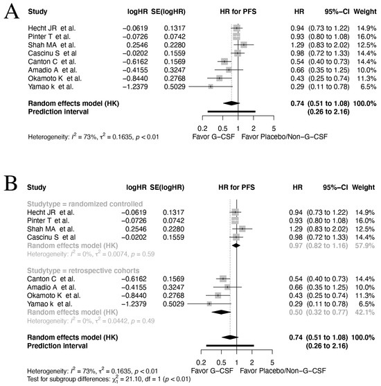 Eight studies reported data on PFS [57,59,61,62,64,65,67,69]. In the pooled analysis, which included all types of GI cancers and study designs, the result showed a potential improvement of PFS in patients receiving G-CSF prophylaxis; however, this was not significant (HR 0.74, 95% CI: 0.51–1.08, I2: 73%, Figure 3A). Also, due to the high heterogeneity between included studies, the prediction interval was correspondingly wide 0.26–2.16 95% CI.