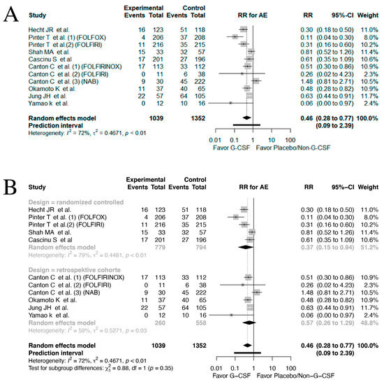 In total, eight studies reported data on AEs [57,59,61,62,64,65,67,68]. A significant decrease in the risk of grade III/IV neutropenia was seen in patients receiving G-CSF prophylaxis (RR 0.46, 95% CI: 0.28–0.77, I2: 72%, Figure 4A), although the prediction interval still contained the null effect 95% CI 0.09–2.39. The significantly lower RR was also seen in the subgroup analysis of the RCTs (RR 0.37, 95% CI: 0.15–0.94, I2: 79%, Figure 4B). However, in the retrospective cohorts, a non-significant association was found (RR 0.57, 95% CI: 0.26–1.29, I2: 59%). The test of inter-subgroup differences were non-significant (p = 0.349). Furthermore, the heterogeneity observed in these analyses was concerningly high.