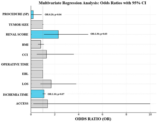Risk assessment for 30-day postoperative complication rates in group B patients is shown in Table 3. Preoperative anthropometric characteristics such as BMI and CCI did not significantly increase the risk of 30-day postoperative complications. Postoperative complication rate was not influenced by any of the analyzed intraoperative predictors (operation time, ischemia time, EBL, and type of access). The only parameter associated with an increased risk of 30-day postoperative complications was preoperative RENAL score (OR: 1.59, 95%CI 1.03–2.4, p = 0.03). As expected, employing the SP surgical robot reduced the risk of 30-day postoperative complications, but the difference did not reach the level of significance at univariate analysis (OR: 0.3, 95%CI 0.08–1.2, p = 0.07). At multivariate analysis, the only variable able to independently influence the risk of 30-day postoperative complication rates were the adoption of the SP robotic system (OR: 0.2, 95%CI 0.04–0.9, p = 0.04) and the preoperative RENAL score (OR 2.3, 95%CI 1.1–4.8, p = 0.03). Of note, the increased risk of complications associated with a prolonged ischemia time was just below the level of significance (OR: 1.1, 95%CI 0.99–1.23, p = 0.07). For better visualization, a bar chart depicting the results of multivariate logistic regression is shown in Figure 1.