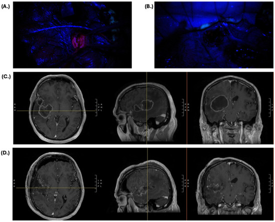 Case example of a 71-year-old patient with a 5.2 cm × 5.0 cm × 4.2 cm (AP × TV × CC) right-sided, peripherally enhancing, cystic, temporo-insular mass suspicious for high-grade glioma and associated with vasogenic edema, 1.0 cm midline shift, and left-sided weakness. The patient underwent a right-sided craniotomy with 5-ALA fluorescence guidance and motor mapping with final pathology consistent with IDH-wildtype, WHO grade IV glioblastoma. In the setting of an IDH-wildtype glioblastoma, (A) 5-ALA allowed for bright, visible fluorescence intraoperatively prior to resection, and, (B) following completion of resection, there was elimination of the fluorescent signal in non-eloquent tissue as identified on motor mapping. Preoperative MRI T1 with contrast images is presented in panel (C), and, in the postoperative MRI in panel (D), the resection of all tissue that could be safely resected is visualized, which was facilitated by the use of both 5-ALA and motor mapping.