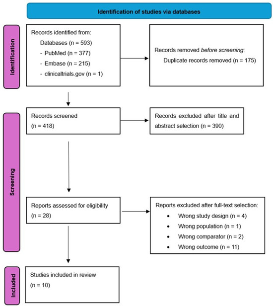 The initial research strategy identified 593 studies (377 from Pubmed, 215 from EMBASE and 1 from Clinicaltrials.gov), 175 of them were duplicates and were excluded. Of the remaining 418 studies, 28 remained after title and abstract selection. On the basis on full text selection, 18 articles were excluded. The remaining 10 were included [13,14,15,16,17,18,19,20,21,22] in the final selection (Figure 1, PRISMA 2020 flow diagram). Supplementary Table S3 lists the excluded studies and the reasons for their exclusion. The primary cause of exclusion was wrong outcome (11 records). Other reasons for exclusion were wrong study design, wrong population and wrong comparator.