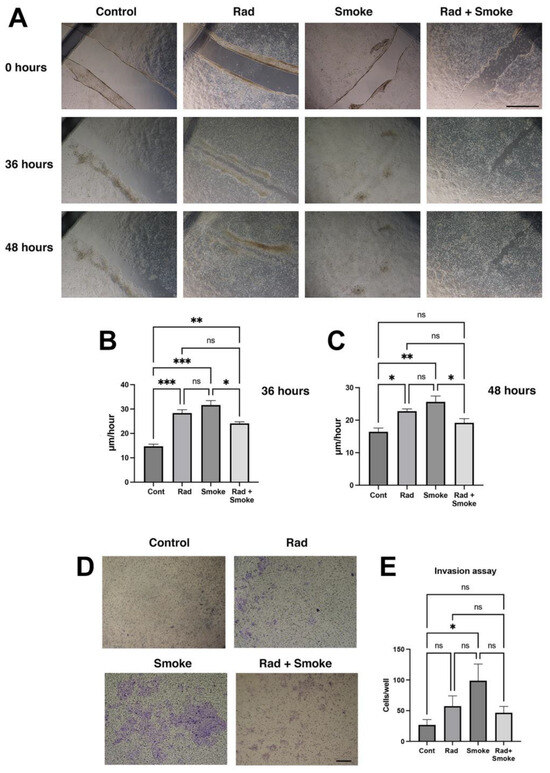 Radiation and cigarette smoke promote migration, wound healing and invasion. Migration assay: control and radiation-, smoke-, and RS-treated cells were allowed to grow to confluency and wounded, or subject to an invasion assay as described in the methods. Images were taken at 0, 36, and 48 h (A), and the wound gap was measured. The rate of healing calculated at µm/hour (B,C); scale bar 1000 µm. Invasion assay: after 4 days, more cells (blue) were on the underside of the membrane in treated cells (D). Quantification demonstrated a non-significant increase in radiation and RS, and a significant 4-fold increase in invasive cells in the smoke-exposed group (E); * p < 0.05; ** p < 0.01; *** p < 0.001; ns = not-significant; scale bar: 250 µm.