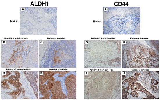 Smoking status does not affect CD44 and ALDH1 staining. Patient biopsy tissues specimens taken at diagnosis and prior to the commencement of treatment. Representative immunohistochemistry for ALDH1 (A–E) and CD44s (F–J) from non-smokers (patients 9, 10, 13, and 14) and smokers (4, 6, 7, and 11). Scale bar: 50 µm.