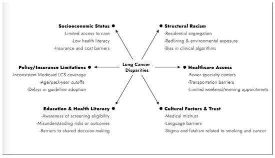 Elements of social determinants of health (SDOH) play an important role in these disparities. Socioeconomic status (SES) significantly impacts lung cancer disparities and influences incidence, treatment, and outcomes (Figure 1). Lower SES is associated with higher lung cancer rates, late diagnoses, and worse survival, with this discrepancy being most evident in Black patients [8]. The etiology of these disparities is multifactorial and often includes downstream effects of systemic racism such as education access, decreased access to healthcare, higher smoking prevalence, and limited economic opportunities [8,9]. In a comprehensive review of how lung cancer risk and structural racism are linked, Bonner et al. summarize seven main domains in the literature. They highlight that poor housing conditions disproportionately affect Black and Hispanic patients. Additionally, Black patients experienced higher occupational exposures to factors known to increase lung cancer risk. The impact of structural racism in policies contributes to increased poverty, decreased access to high-quality health insurance, as well as implicit medical biases [9]. Health literacy, often lower among individuals with low SES, further exacerbates challenges in accessing and understanding healthcare, affecting clinical decision-making and outcomes [9,10]. Ultimately, these social determinants perpetuate the disparities observed in lung cancer incidence and survival rates among disadvantaged populations. Addressing disparities in lung cancer screening, treatment, and survival could significantly reduce the morbidity and mortality burden of this disease.