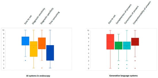 In real life, about one-half (49.3%) of participants used AI tools in endoscopy at the time of the survey. The median perception of AI systems for endoscopy was 8 (6–8) for simplicity in use, 6 (3–7) for diagnostic sensitivity, 6 (5–8) for diagnostic specificity, and 5 (2–6) for extension of procedure time on a scale from 1 to 10 (Figure 1). On the other hand, 40% of respondents also used generative language systems. In this regard, median perception was 7 (5–9) for simplicity in use, 6 (5–7) for completeness and for correctness of answers, and 7 (6–8) for comprehensibility of answers (Figure 1). Only 23/150 (15.3%) respondents used AI tools other than endoscopy ones and generative language systems, mainly in the hepatology and IBD settings.
