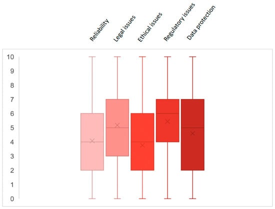 About one-half of the participants raised a fair concern about using AI systems in gastroenterology. The main concern was on regulatory issues, with a median score of 6 (4–7) on a scale from 1 to 10, followed by legal and data protection, with a median score of 5 (3–7) and 5 (2–7), respectively (Figure 2). On the contrary, a fair concern was expressed regarding the reliability of the tools and ethical issues, with a median score of 4 (2–6) (Figure 2).