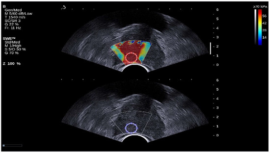 The advancement of medical imaging techniques over the years has significantly enhanced the quality of PCa diagnoses. Ultrasound (US) and magnetic resonance imaging (MRI) are the primary imaging modalities used in PCa detection. Although MRI offers greater sensitivity than the US, it comes at a considerably higher cost and is not suitable for all patients, particularly those with pacemakers, ferromagnetic metals, or those who suffer from claustrophobia. B-mode ultrasound is the fundamental parameter for assessing lesions’ location, size, and shape. However, the identification of lesions in b-mode images depends on echogenicity, meaning that some PCa lesions may appear isoechoic, displaying a brightness similar to that of the prostate gland [3]. Another ultrasound technique frequently employed in PCa diagnosis is shear-wave elastography (SWE). This quantitative method evaluates shear-wave velocity through the application of an acoustic radiation force impulse (ARFI) to the tissue, which estimates Young’s modulus of the tissue [4]. The results are presented as a superimposed color map overlaid on each pixel of the grayscale ultrasound image [5]. SWE demonstrates higher sensitivity and specificity in detecting PCa compared to other ultrasound modalities [6]. However, it does face limitations in detection depth, which restricts its ability to measure deeper regions of the prostate [7]. Additionally, the accuracy of SWE results can be adversely affected by the presence of prostate stones or calcifications [8,9].