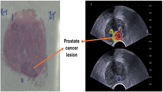 Visualization of prostate cancer lesion in the SWE and B-mode ultrasound (Right side), confirmed by radical prostatectomy image (Left side).
