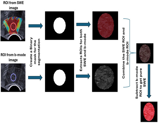 Illustration of creating a pure SWE ROI. After selecting ROIs on both SWE and b-mode ultrasound images, binary masks are created for segmentation. ROIs are extracted from both images, combined, and subtracted from the b-mode ROI to obtain the pure SWE ROI.