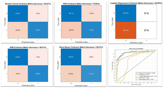 A systematic methodology was implemented to evaluate the performance of five different machine learning models: random forest (RF), KNN, logistic regression (LR), SVM, and naive bayes (NB), These models were selected based on their proven effectiveness in medical imaging and classification tasks [32,33,34], Two complementary validation techniques were employed to evaluate the effectiveness of the machine learning models. Initially, a hold-out validation method was applied, which involved designating 30% of the dataset as a separate test set, while the remaining 70% was used for training purposes. In addition, on a classification task on the selected features. Five k-fold cross-validation was employed, which allowed us to divide the dataset into training and testing subsets for each fold. In this approach, the entire dataset is partitioned into five distinct subsets. In each iteration, one of the subsets is utilized as the test set, while the remaining four subsets serve as the training set. This procedure is repeated for all five subsets, ensuring that each one is tested in turn [35]. The hyperparameters for each classifier were selected based on relevant research in the field of medical imaging and machine learning [36,37]. The chosen values were derived from the literature that has successfully optimized these parameters for similar classification tasks, ensuring their suitability for our dataset and problem area. For each model, the performance on the testing subset, calculating the means of the five folds with the standard deviation of metrics such as accuracy, sensitivity, specificity, and area under the receiver operating characteristic curve (AUC), was achieved. In addition, confusion matrices were provided to derive these metrics, ensuring a comprehensive evaluation of each model’s classification performance.