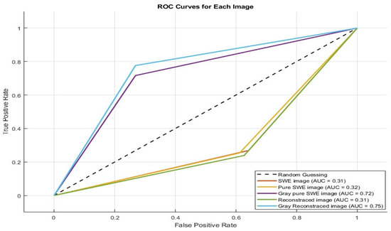 The results of the machine learning models reveal interesting performance trends across different image preprocessing techniques and categories of cases (true positive, true negative, false positive, and false negative). Gray Pure SWE and Gray Reconstructed images consistently outperformed other methods, achieving sensitivities, specificities, and accuracies of 71.6–98%, 73.1–96%, and 72.4–97%, respectively. These findings suggest that converting images to grayscale enhances texture analysis by capturing more discriminative features, leading to improved classification of normal and malignant tissues. Conversely, SWE images and reconstructed images in their raw forms demonstrated poor performance, with sensitivities, specificities, and accuracies below 40% in most cases. This discrepancy highlights the importance of preprocessing techniques in enhancing model performance.
