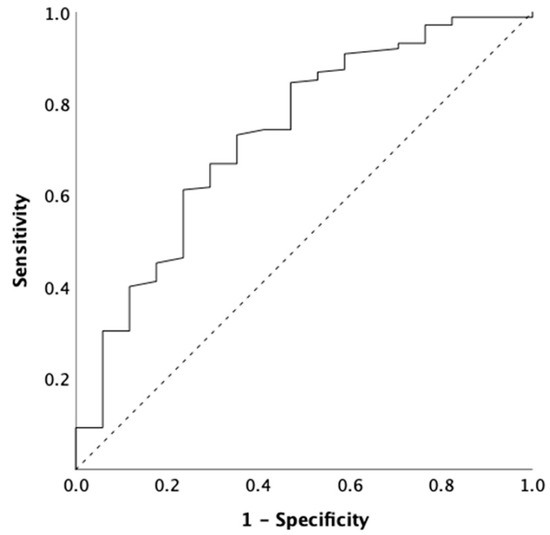 The optimal cut-off value for fibrinogen pretreatment. ROC curve showing the sensitivity and specificity of serum fibrinogen to determine patients with elevated and non-elevated values (AUC: 0.732; 95% CI: 0.60–0.86; p < 0.001). Abbreviations: ROC = receiver operating characteristic; AUC: area under the curve; CI = confidence interval.