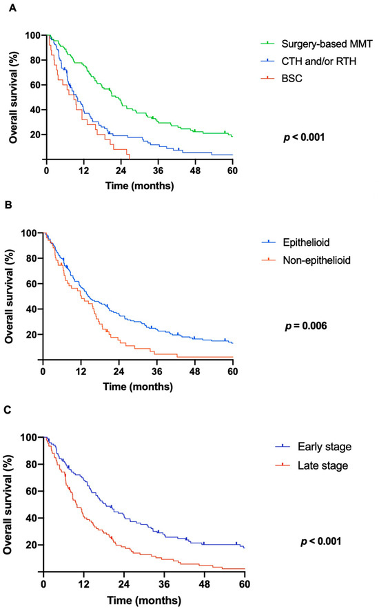 (A) Kaplan–Meier survival analysis for patients after different treatment modalities. Patients undergoing multimodality treatment protocols including macroscopic complete resection survived significantly longer (median OS: 22.3 months; 95% CI: 18.6–26.0; p < 0.001) when compared to patients treated with chemo- and/or radiotherapy alone (9.8 months, 95% CI: 6.7–12.8) or those receiving best supportive care (8.8 months, 95% CI: 4.2–13.5). (B) Kaplan–Meier survival analysis showed significant overall survival benefit in patients with epithelioid histology compared to patients with non-epithelioid subtypes (14.3 months [95% CI: 10.5–18.1] vs. 12.2 months [95% CI: 6.1–18.3]; p = 0.006). (C) Kaplan–Meier survival analysis for patients with early- vs. late-stage disease: median survival time of 21 months [95% CI: 15.3–26.7] vs. 9.5 months [95% CI: 7.0–12.9]; p < 0.001. Abbreviations: MMT = multimodality treatment; CTH = chemotherapy; RTH = radiotherapy, BSC = best supportive care; OS = overall survival; CI = confidence interval.