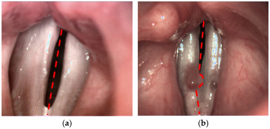 Different approaches for the partitioning of the glottis into left and right side: (a) using straight symmetry axis and (b) locally adapted boundary to avoid assigning right vocal lesion to the left side.