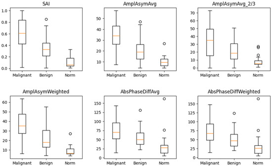 The kymographic parameters were compared across three distinct patient groups: normophonic individuals, benign lesion patients, and malignant lesion patients. The statistical comparison revealed six key parameters that differed significantly between all three groups, based on the U Mann-Whitney test (p < 0.01). Among these, the Stiffness Asymmetry Index (SAI) emerged as a critical factor, along with two parameters describing phase difference and three parameters quantifying amplitude asymmetry (Table 2). These findings suggest that these parameters provide strong differentiating power when evaluating different types of vocal fold lesions.