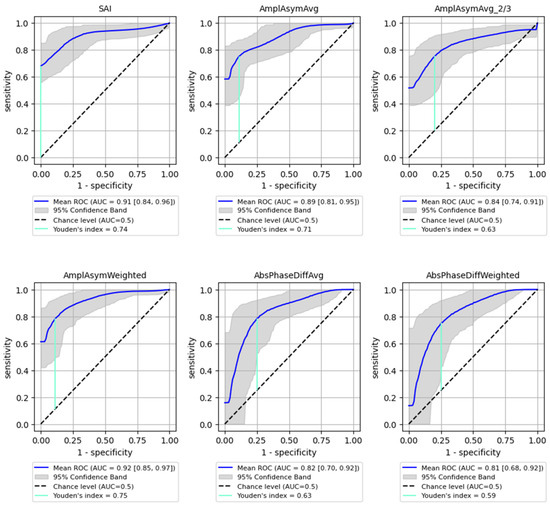 Youden indexes are calculated for the mean ROC curves, but the threshold cutoff-values can only be given for the full original data. Otherwise, determination of a cutoff value is ambiguous. A higher Youden Index indicates a better balance between sensitivity and specificity, making it a useful metric for selecting the optimal diagnostic threshold for parameters such as SAI and amplitude asymmetry.