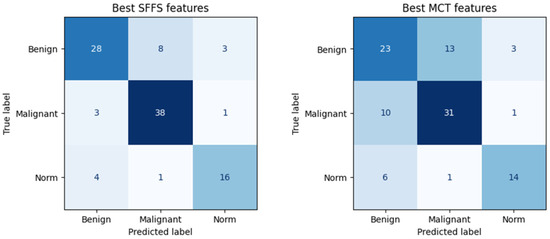 The SFFS-based model showed superior performance compared to the model trained using parameters selected in MCT analysis, correctly classifying 72% of benign lesions, 91% of malignant lesions, and 76% of normophonic subjects. While for MCT it was respectively correctly classified 59% benign lesions, 74% malignant lesions and 67% of normophonic subjects. The results of the SFFS and MCT analyses are presented in the confusion matrices in Figure 5. These findings highlight the effectiveness of integrating multiple attributes within a machine learning framework, which exceeds the predictive performance of individual parameters whose significance was established independently through univariate statistical analysis.