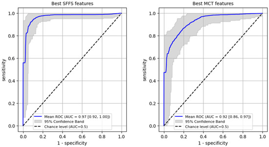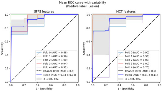 Subsequently, 5-fold cross-validation testing was conducted to differentiate normophonic subjects from patients with any organic lesion of the glottis, whether benign or malignant. This testing achieved a mean AUC of 0.93 for the SFFS algorithm and a mean AUC of 0.91 for the MCT univariate analysis (Figure 7). The sensitivity metrics remained relatively high, at 97.5% for the SFFS analysis and 93.8% for the MCT analysis. However, specificity decreased to 62% for SFFS and 71% for MCT.