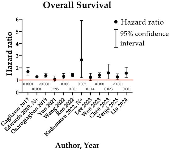 | Marziali et al. [45], 2023, Italy | pT1-4N2M0 (68) | Retrospective, Single-Institution | 37 (54%) | 31 (46%) | 3.2 (0.008) | 2 (0.002) |