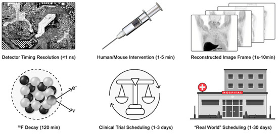 Variance in patient scheduling limits the time resolution of medical imaging. The process chain of deploying a medical diagnostic must be considered to identify the limiting rate of the process sampling frequency. e+ is a positron and ν is a neutrino.