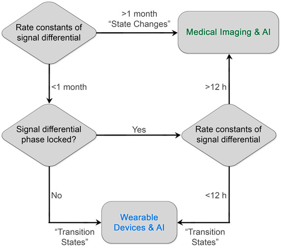 Additionally, there is a rare exception: pathways that are still suited to medical imaging when predictive power lies in the high-frequency domain. That subset consists of highly phase-locked, short-rate-constant diagnostic processes. If treatment potently induces novel diagnostic information on the scale of about 12 h or more, a variety of imaging test and retest scenarios, including 18F-based PET, may be enabled. Thus, most phase-locked systems will remain more amenable to monitoring through wearable devices unless spatial information is truly critical.