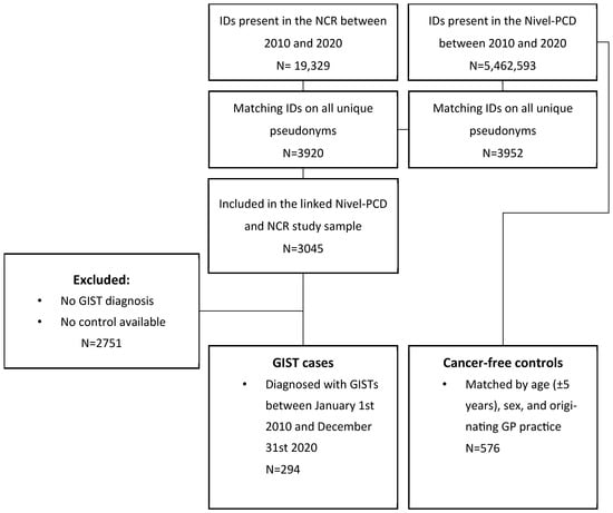 Adults (≥18 years) diagnosed with GISTs (ICD-10-GM codes C49.A0-C49.A5 and C49.A9) between 1 January 2010 and 31 December 2020 were identified within the NCR, linked to the Nivel-PCD data, and included in the study. Patients with other types of soft-tissue or bone sarcomas were excluded and presented in a separate paper [24].