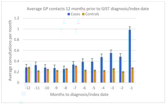 Mean number of monthly GP contacts in the 12 months prior to GIST diagnosis/index date.