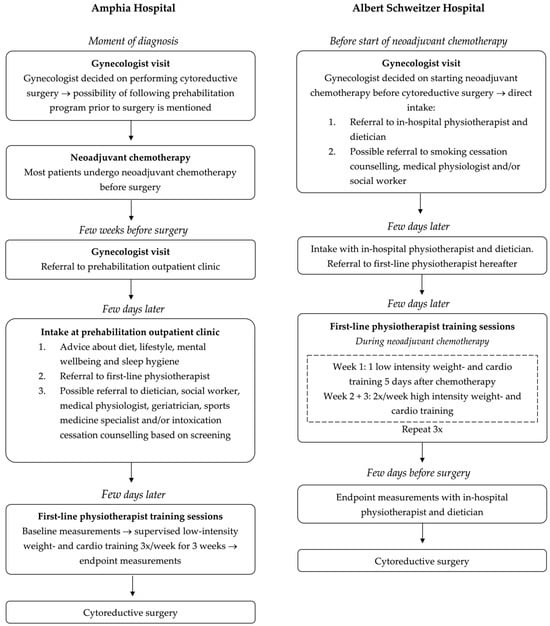 At the Albert Schweitzer Hospital, the prehabilitation program started at the same time as neoadjuvant chemotherapy and lasted nine weeks. This program is based on the PADOVA trial, where OC patients undergoing (neo)adjuvant chemotherapy were randomized between exercise and dietary intervention or standard care [,].