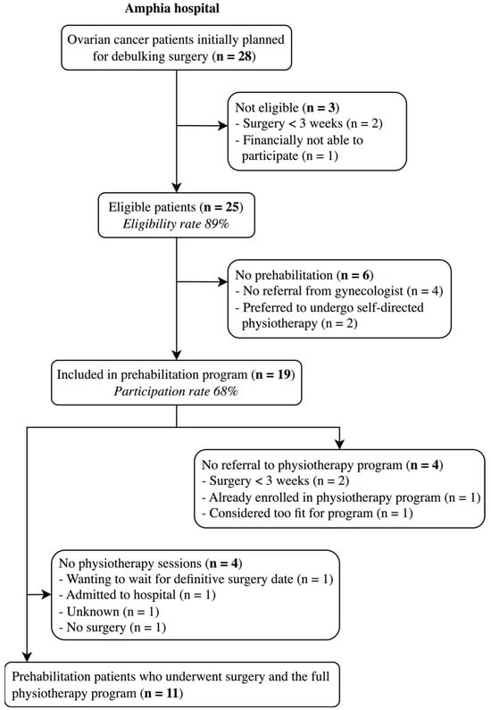 At the Amphia Hospital, 28 patients with OC were initially scheduled for cytoreductive surgery during the study period (Figure 2). Three patients were ineligible for prehabilitation; two had surgery scheduled within three weeks, making prehabilitation unfeasible, and one declined participation due to the cost of physiotherapy treatments. This results in an eligibility rate of 89%. Six out of the 25 (24%) eligible patients did not participate in the prehabilitation program; four were not referred by their gynecologist for unspecified reasons, and two preferred to undergo self-directed physiotherapy. These patients, along with the ineligible patients, were assigned to the non-prehabilitation group. With 19 out of 28 patients participating in the prehabilitation program, the participation rate was 68%. Following intake at the prehabilitation outpatient clinic, 15 of 19 patients (79%) were referred to the physiotherapist. Of the four who were not referred, two patients had surgery within three weeks, one was already enrolled in a physiotherapy program, and one patient was considered too fit for physiotherapy. Among the 15 referred patients, three did not attend any training sessions: one delayed participation until the surgery was confirmed but had less than three weeks remaining, one was hospitalized due to weakness after neoadjuvant chemotherapy, and one did not schedule physiotherapy appointments for unknown reasons. One patient in the prehabilitation group did not undergo cytoreductive surgery due to disease progression during chemotherapy but remained included in the prehabilitation group, although no appointment for the endpoint measurement was scheduled. In the end, 11 prehabilitation patients underwent both surgery and the full prehabilitation program.