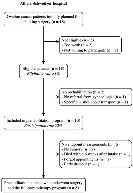 At the Albert Schweitzer Hospital, the eligibility rate was 83%. Of the 18 patients scheduled for neoadjuvant chemotherapy and cytoreductive surgery, three patients were ineligible: two due to frailty and one due to unwillingness to participate (Figure 3). Two eligible patients did not participate in the prehabilitation program; one patient was not referred by the gynecologist for unknown reasons, and the other dropped out after the intake due to transportation preferences. As 13 of the 18 eligible patients participated in the prehabilitation program, the participation rate was 72%. The two eligible patients who did not undergo prehabilitation, along with the ineligible patients, were assigned to the non-prehabilitation group. Ultimately, 13 patients followed the program, but five did not complete the trajectory. Two patients did not undergo surgery due to extensive disease found during diagnostic laparoscopy, one died after the first cycle of neoadjuvant chemotherapy (severely obese (BMI 47), likely due to massive pulmonary embolisms), one missed the endpoint measurement appointment and one discontinued early. The latter had Steinert myotonic dystrophy with chronic hypercapnia. Physiotherapy was too exhausting for her, and she was considered too high-risk for surgery.