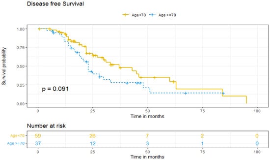 Regarding DFS between both age groups, five-year DFS was 13% for older patients and 37% for patients under 70 (p = 0.091) (Figure 1). DFS was adjusted for patient-related factors that could potentially affect survival. Univariate and multivariate analysis showed that age ≥70 (aHR = 1.24. 95% IC, 0.55–2.78, p > 0.05) and non-standard treatment (aHR = 0.58. 95% IC, 0.24–1.4, p > 0.05) did not independently predict worse DFS of ovarian cancer patients. However, being diagnosed at higher stages (III–IV) increases the risk of recurrence by more than three times (aHR 3.44; 95% IC, 1.50–7.87, p = 0.003), and the presence of tumoral ascites doubles it (aHR 2.23; 95% IC, 1.15–4.35, p = 0.018), as independent predictive factors (Table 3).