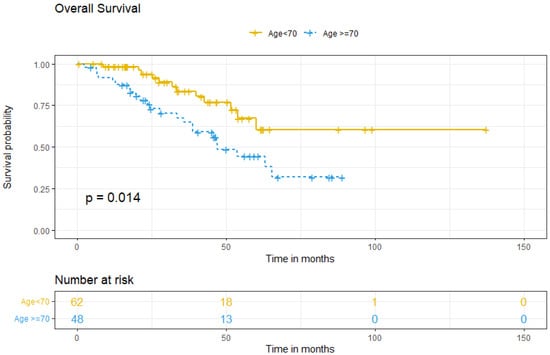 Survival analysis between groups showed that the five-year OS for patients <70 was 67.2%, compared to 44.4% for older patients (p = 0.014) (Figure 2). Multivariate analysis for OS showed that ≥70, comorbidity, FIGO stage at diagnosis, tumoral ascites, and treatment type did not independently predict worse OS (Table 4).