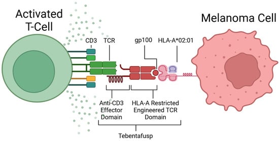 The discovery of TCR recognition of glycoprotein 100 (gp100) began the development of this form of therapy [72]. TEBE’s TCR binds to gp100, located on the surface of melanoma cells, and its anti-CD3 domain binds to CD3, located on all T-cells (see Figure 3) [68]. This bispecific binding brings T-cells into close contact with melanoma cells and creates a bridge between the two cells, where the T-cell recognises the tumour cell and induces apoptosis (see Figure 2D) [73].