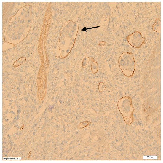 Using monoclonal antibodies against podoplanin (D2-40), the peritumoral LVD was measured at the junction of the tumor and healthy tissue according to the methods of Weidner et al. [28]. First, under low microscope magnification (×100), areas with a high density of lymphatic vessels, so-called hot spots, were identified. Then, in the hot spots, under high microscope magnification (×200), the lymphatic vessels were counted, taking the average value of the measurements at three points as a measure of LVD. Each cluster of endothelial cells or individual vessel was regarded as a hot spot and counted as one microvessel. For the purpose of assessing the impact of LVD on prognosis, tumors were divided into two groups based on median vessel density. Figure 2 shows a microscopic image of labeled lymphatic vessels with the presence of tumor cell emboli.