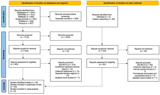 A total of 2241 records were identified by searching the electronic databases mentioned in the Section 2. In our initial search, a total of 25 trials were identified and are summarised. However, upon applying our inclusion/exclusion criteria and the quality assessment (using the Joanna Briggs Institute (JBI) Critical Appraisal Tool), only 20 studies met all the criteria for inclusion in the systematic analysis. Ultimately, 20 [,,,,,,,,,,,,,,,,,,,] clinical trials were deemed suitable for inclusion in this review (Figure 1).