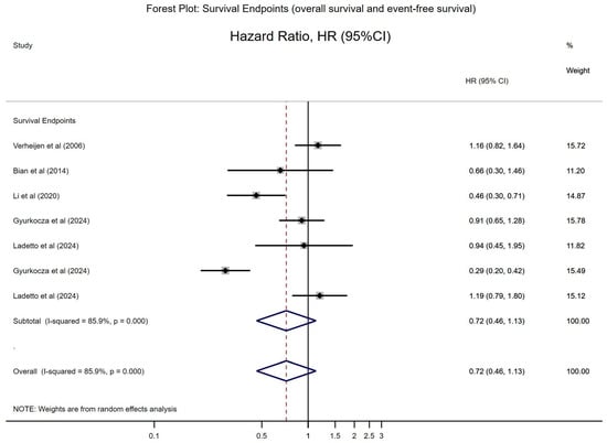 Meta-analysis of survival endpoints regarding the effectiveness of radioimmunotherapy [,,,,].