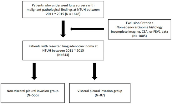 This retrospective, single-center study included 1648 consecutive patients diagnosed with lung cancer who underwent curative-intent pulmonary resection at NTUH between January 2011 and December 2015. Patients were excluded if they lacked complete preoperative chest CT imaging, serum carcinoembryonic antigen (CEA) level data, or pulmonary function test results (Figure 1). Available clinicopathological profiles were retrospectively reviewed, and the correlations between VPI and CT characteristics were analyzed. Informed consent was obtained from all 643 patients before study entry, and data regarding their basic profile, preoperative CT imaging characteristics, and postoperative events were collected. The study was approved by the Human Research Ethics Committee of NTUH (202408169RINC).