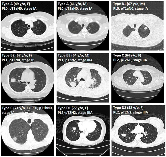 DFVP image examples. Type A, 49 y/o Female, left upper lobe 1.3 cm tumor, adenocarcinoma, PL0, pT1aN0, stage IA; 61 y/o Male, left upper lobe 1.9 cm tumor, adenocarcinoma, PL0, pT1aN0, stage IA. Type B1, 67 y/o Male, left upper lobe 1.9 cm tumor, adenocarcinoma, PL0, pT1aN0, stage IA. Type B2, 67 y/o Female, right upper lobe 2.5 cm tumor, adenocarcinoma, PL1, pT2N0, stage IB. Type B3, 64 y/o Male, right upper lobe 3.7 cm tumor, adenocarcinoma, PL1, pT2N2, stage IIIA. Type C, 71 y/o Female, right upper lobe 2.3 cm tumor, adenocarcinoma, PL0, pT1bN0, stage IA; 64 y/o Female, right upper lobe 1.8 cm tumor, adenocarcinoma, PL2, pT2N0, stage IIA. Type D1, 77 y/o Female, right lower lobe 2.5 cm tumor, adenocarcinoma, PL2, pT2N2, stage IIIA. Type D2, 52 y/o Female, right upper lobe 2.8 cm tumor, adenocarcinoma, PL2, pT2N2, stage IIIA.