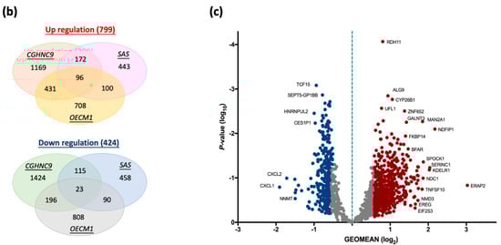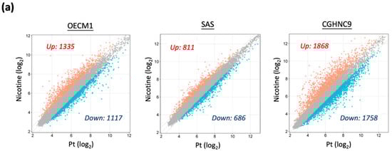 Using a threshold of |FC| ≥ 1.5, we identified significant transcriptional alterations in nicotine-treated sublines. In OECM1-Nic cells, 2452 DEGs were detected, including 1335 upregulated and 1117 downregulated transcripts relative to parental OECM1-Pt cells. Similarly, SAS-Nic cells exhibited 1497 DEGs, with 811 upregulated and 686 downregulated transcripts. In CGHNC9-Nic cells, 3626 DEGs were observed, comprising 1868 upregulated and 1758 downregulated transcripts compared to their parental counterparts.