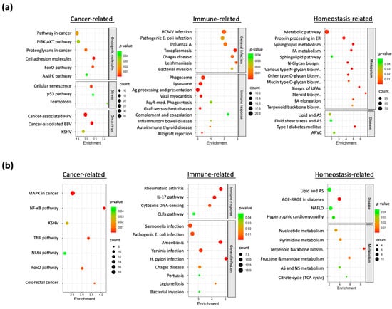 To elucidate the biological processes underlying the nicotine-adapted phenotype in HNC cells, we performed functional pathway enrichment analyses on the upregulated and downregulated DEGs using the DAVID bioinformatics tool. Enrichment results for the 799 upregulated genes, presented in Figure 3a, revealed pathways grouped into three primary modules: cancer-associated, immune-related, and homeostasis-related. The cancer-associated module showed significant enrichment in pathways such as PI3K-AKT signaling, cell adhesion mechanisms, stress response, and oncoviral infection, suggesting oncogenic activation in nicotine-exposed cells. The immune-related module included pathways linked to viral and parasitic infections, indicating that nicotine exposure may impair immune surveillance and increase pathogen susceptibility. The homeostasis-related module featured metabolic biosynthesis pathways, pointing to nicotine-induced metabolic alterations that may contribute to tumorigenesis.