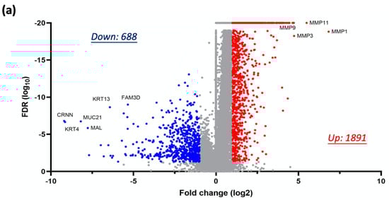 To identify clinically relevant genes implicated in the malignant transformation of head and neck cancer (HNC), we analyzed differential gene expression profiles between normal tissues (N = 44) and tumor tissues (N = 520) from HNC patients using the TCGA-HNSC dataset. Applying stringent selection criteria (|FC| ≥ 2.0 and FDR-adjusted p ≤ 0.05), we identified 2579 DEGs, comprising 1891 overexpressed and 688 underexpressed genes in tumor tissues (Figure 4a). Among these, matrix metalloproteinase (MMP) family members—including MMP1, MMP3, MMP9, and MMP11—exhibited significant upregulation, consistent with their established roles in promoting tumor invasiveness. Conversely, genes critical for maintaining epithelial cell integrity, such as CRNN, MUC21, KRT4, and KRT13, were markedly downregulated. These findings indicate that malignant transformation is characterized by the increased expression of proteolytic enzymes that enhance invasiveness and the decreased expression of structural proteins, leading to compromised cellular integrity.