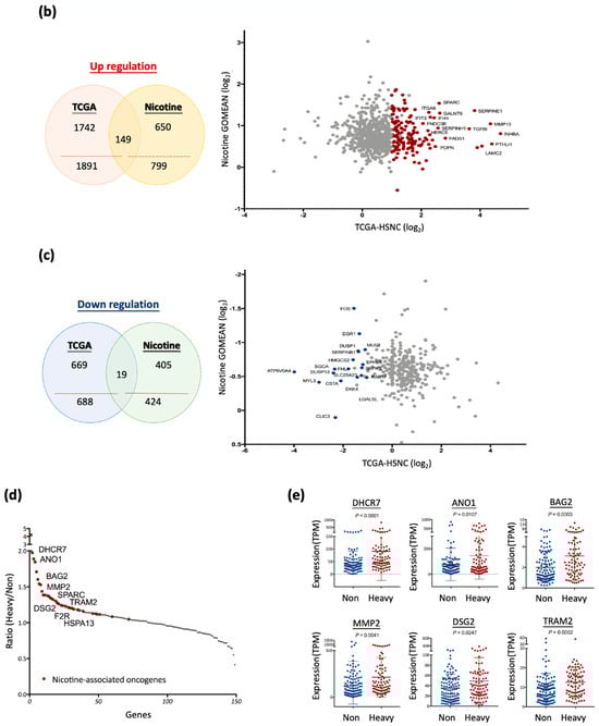 Nicotine-driven gene expression profiles and their association with HNC malignant transformation. (a) A volcano plot depicting the differentially expressed genes (DEGs) associated with malignant transformation in the TCGA-HNSC cohort. Gray dots indicate DEGs with no significant change between the tumor and normal groups; blue and red dots indicate underexpressed and overexpressed genes, respectively. (b) A Venn diagram illustrating the overlap of upregulated oncogenic genes between the TCGA-HNSC cohort and nicotine-induced gene expression profiles. (c) A Venn diagram illustrating the overlap of downregulated tumor-suppressive genes between the TCGA-HNSC cohort and nicotine-reduced gene expression profiles. (d) A scatter plot illustrating the ratio of 149 oncogenes expression (Heavy-smoker/Non-smoker) in the TCGA-HNSC cohort, highlighting nicotine-associated oncogenes (red dots). (e) Dot plots showing the expression levels of six nicotine-associated oncogenes (DHCR7, ANO1, BAG2, MMP2, DSG2, and TRAM2) in non-smoker (Non) and heavy-smoker (Heavy) HNC patients. Statistical significance was determined using the Wilcoxon rank-sum test.