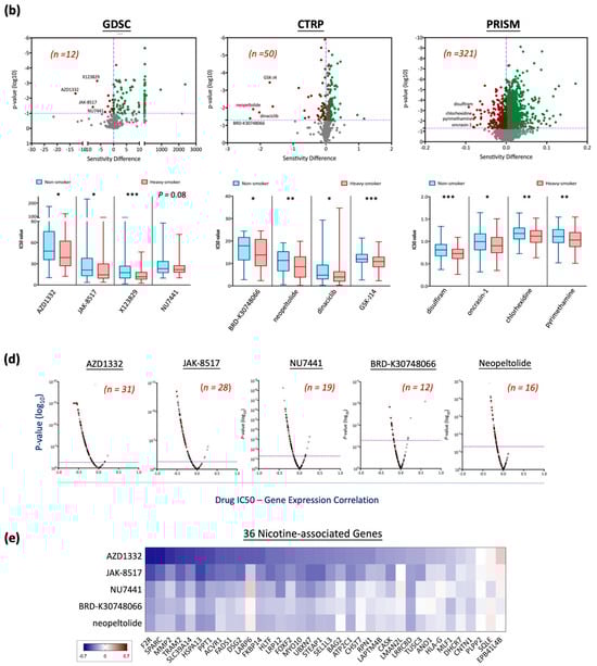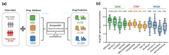 Given the elevated therapeutic resistance and poorer survival rates observed in smoking patients [,,,], we investigated potential therapeutic agents targeting nicotine-regulated cancer progression through a drug repurposing strategy (Figure 5a). This approach aimed to identify drugs with selective sensitivity to HNC tumor tissues by analyzing correlations between drug efficacy and gene expression profiles in tumors from heavily smoking patients (N = 82) versus non-smoking patients (N = 111) using the TCGA-HNSC dataset. Transcriptomic profiles were integrated with drug sensitivity data (IC50 values) from three major databases—GDSC, CTRP, and PRISM [,,]—using the oncoPredict R package []. Applying a linear ridge regression model with thresholds of p < 0.1 for GDSC and p < 0.05 for CTRP and PRISM, we identified 12 drugs from GDSC, 50 from CTRP, and 321 from PRISM exhibiting high potential sensitivity in HNC patients with a smoking history (Figure 5a,b).
