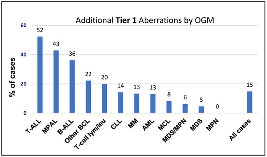 OGM identified additional Tier 1 variants in 75 of 519 cases (15%), with detection rates varying by disease type, ranging from 0% in MPN to 52% in T-ALL. Notably, more than 30% of B-ALL, T-ALL, and MPAL cases harbored Tier 1 aberrations that were exclusively detected by OGM (Figure 2).